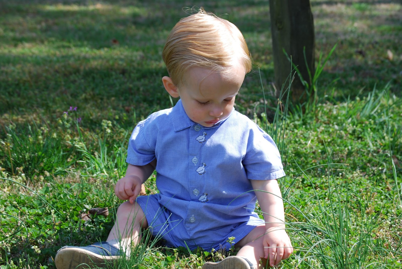 We had a little photo shoot in his Easter outfit. Joslin was there of course there, considering it was in their yard. Most of Jude's smiles are thanks to her! Sitting angelically in a grassy field only lasted so long before he was off hauling around the largest, dirtiest object with the most sharp claws that he could find. Typical Jude. Typical boy! LOVE it. :)